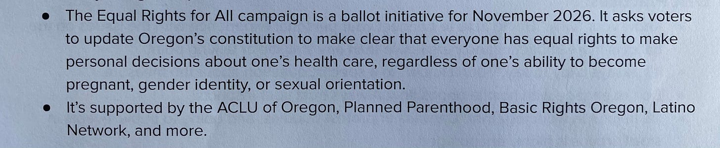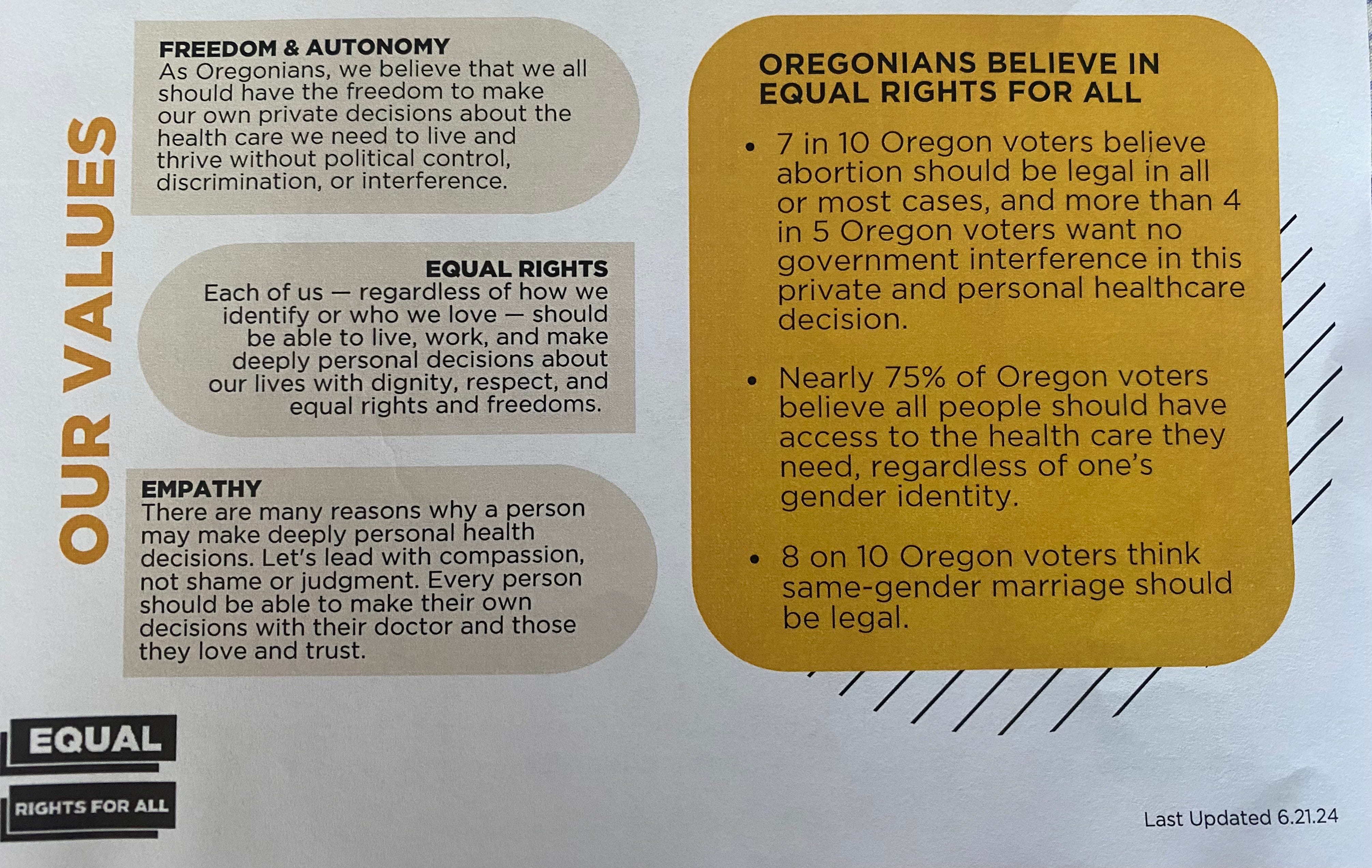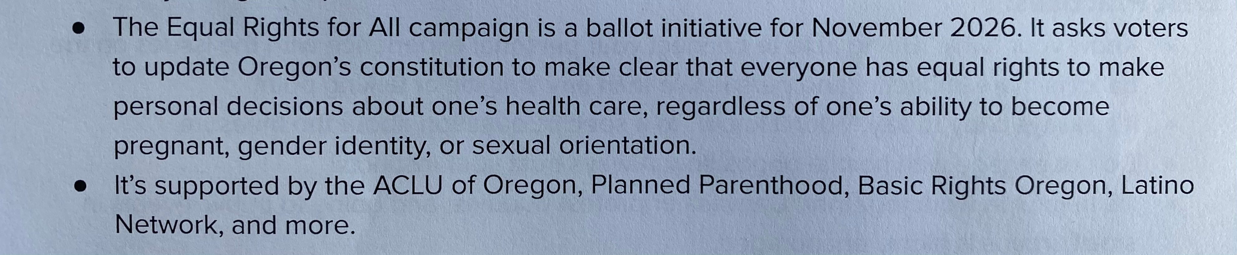 Our ERA ballot measure in Oregon will safeguard the right to bodily autonomy for every Oregonian. It will protect abortion and gender affirming care in Oregon’s constitution and will eliminate the current definition of marriage as between a man and a woman.